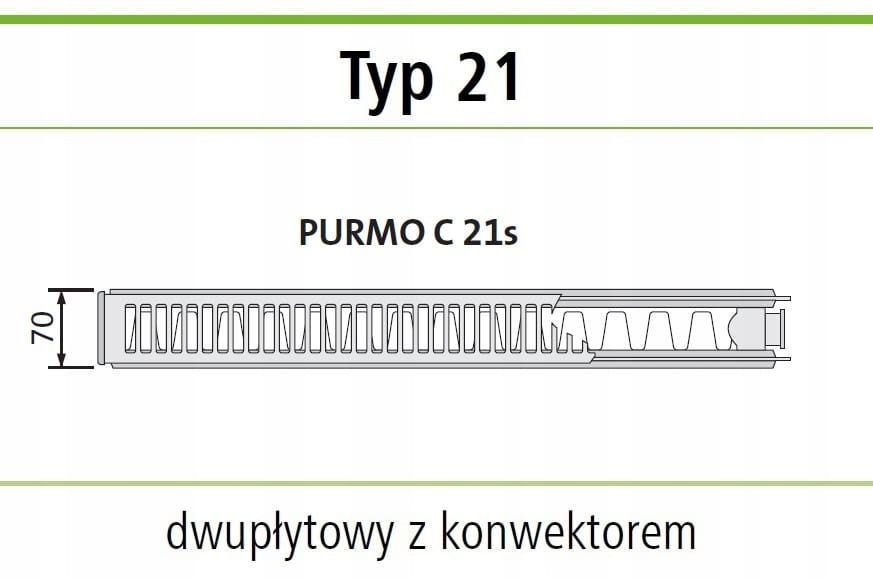 Opis:Purmo Compact to stalowe grzejniki płytowe z bocznym podłączeniem do instalacji. Stanowią idealne wyposażenie domowej instalacji grzewczej. Te pokojowe grzejniki polecane są jako urządzenia grzewcze montowane w sypialniach, pokojach dziennych, kuchniach. Montaż jest możliwy zarówno na ścianie jako grzejniki wiszące, opcjonalnie można uzyskać grzejniki stojące montując je na podłodze na specjalnych stojakach.Pokojowe grzejniki Purmo posiadają powierzchnie boczne obudowane osłonami oraz powierzchnię górną przykrytą osłoną typu grill. Dostępne są w szerokim zakresie typów i rozmiarów, dlatego łatwo dobrać grzejnik do pomieszczenia każdej wielkości. Grzejniki typu C wyposażone są w cztery boczne otwory przyłączeniowe w każdym narożniku grzejnika z gwintem wewnętrznym 1/2?.