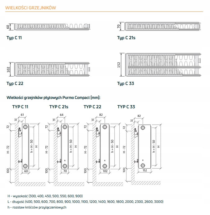 Opis:Purmo Compact to stalowe grzejniki płytowe z bocznym podłączeniem do instalacji. Stanowią idealne wyposażenie domowej instalacji grzewczej. Te pokojowe grzejniki polecane są jako urządzenia grzewcze montowane w sypialniach, pokojach dziennych, kuchniach. Montaż jest możliwy zarówno na ścianie jako grzejniki wiszące, opcjonalnie można uzyskać grzejniki stojące montując je na podłodze na specjalnych stojakach.Pokojowe grzejniki Purmo posiadają powierzchnie boczne obudowane osłonami oraz powierzchnię górną przykrytą osłoną typu grill. Dostępne są w szerokim zakresie typów i rozmiarów, dlatego łatwo dobrać grzejnik do pomieszczenia każdej wielkości. Grzejniki typu C wyposażone są w cztery boczne otwory przyłączeniowe w każdym narożniku grzejnika z gwintem wewnętrznym 1/2?.